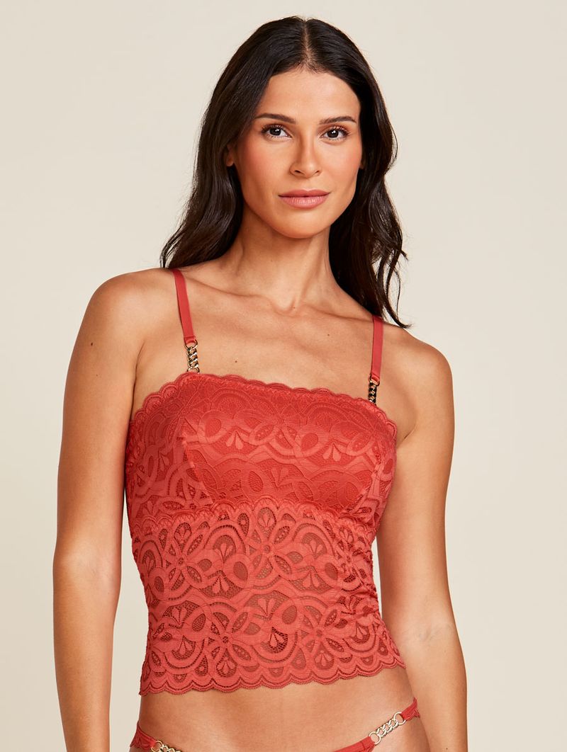 • Aviamento exclusivo de corrente em metal dourado no início das alças