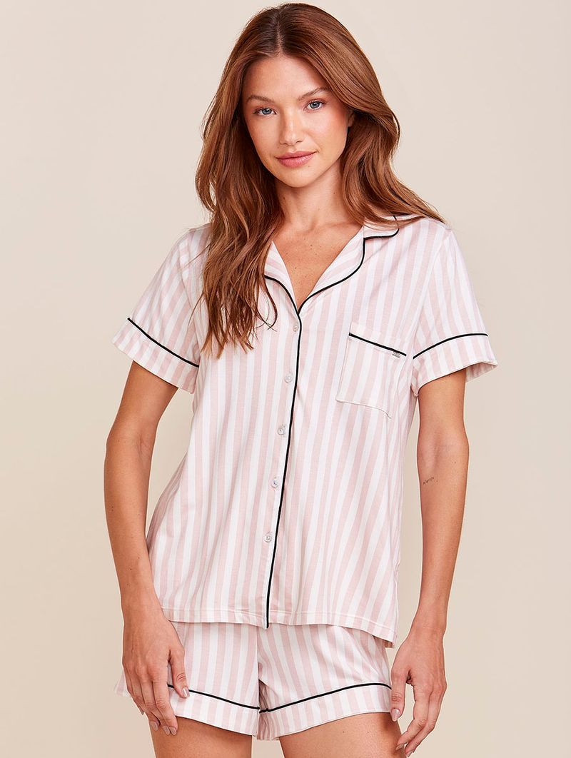 • Pijama de blusa manga curta com gola, abotoamento frontal e bolso lateral